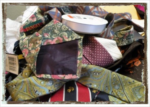 So, I started with my pile of ties (from Rummage Sales, Grandpa, and the Dollar Tree), and a spool of white ribbon.